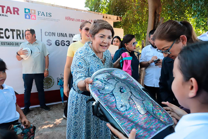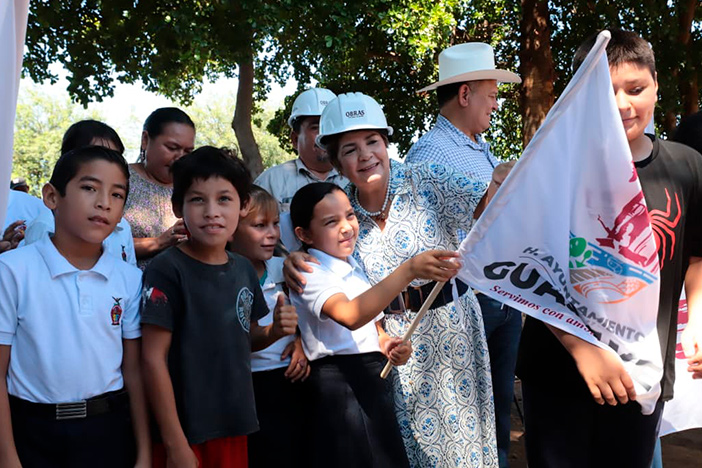 En esta comunidad entregó mochilas a estudiantes del kínder Niños Héroes y de la Escuela Primaria Ignacio Allende y visitó las instalaciones de la Cocina Comunitaria, acompañada por la presidenta de DIF Guasave, Ana Luisa León Perea. También supervisó el avance de construcción de tres cuartos dormitorios, que se construyen con recursos del Ramo 33.