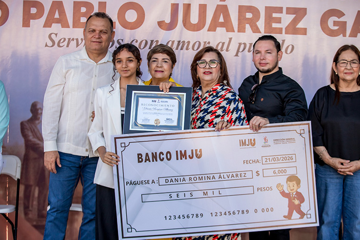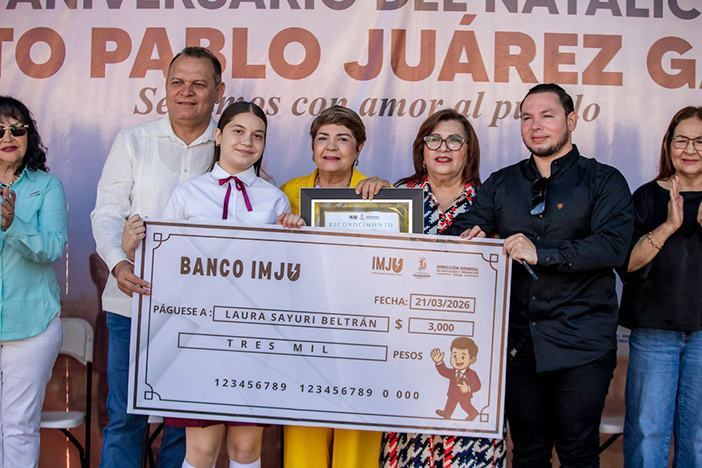 La presidenta municipal, junto con César Hernández Low, director del IMJU premió a los ganadores de este concurso. Dania Romina Álvarez, alumna de la ETI 28, primer lugar, recibió 6 mil pesos; el segundo lugar, Sebastián Cota Olivas, de la Escuela Secundaria Técnica 53, de La Trinidad, 4 mil pesos (no pudo asistir al evento) y Laura Sayuri Beltrán Gastélum, de la EST. No. 4, 3 mil pesos.