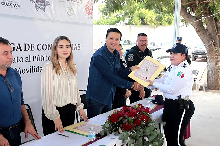 Feliciano Valle Sandoval, secretario del Ayuntamiento, en representación de la alcaldesa, la Dra. Cecilia Ramírez Montoya, encabezó esta ceremonia, en donde resaltó que Guasave está en la lista de los municipios más seguros en México y tenemos una corporación que actúa las 24 horas, pero es importante que los agentes, como servidores públicos, tengan herramientas para dar una mejor atención a la ciudadanía en operativos y en la proximidad social.